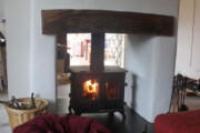 The fireplace has been enlarged and a pre-stressed lintel fitted, new slate hearth, Stovax Durban White Matt tiles, Focus fireplaces Woodstock Oak surround, the chimney was lined and the stove was resprayed in golden fire brown paint and the handles were changed for brass ones.